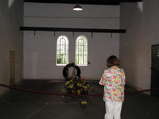 Gedenkstätte Plötzensee Im Raum, in dem die Hinrichtungen stattfanden, gedenkt Johanna der Ermordung ihres Onkels Franz Leuninger. Im Hintergrund zieht sich ein eiserner Träger mit fünf Fleischerhaken von Wand zu Wand.